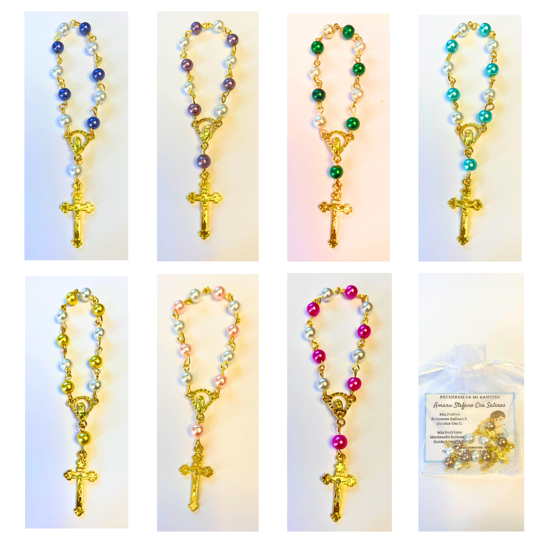 Las perlitas son de cristal , la cruz es metálica color dorado, incluye tarjeta personalizada y bolsita de organza, el denario completo mide 12 cm aprox.