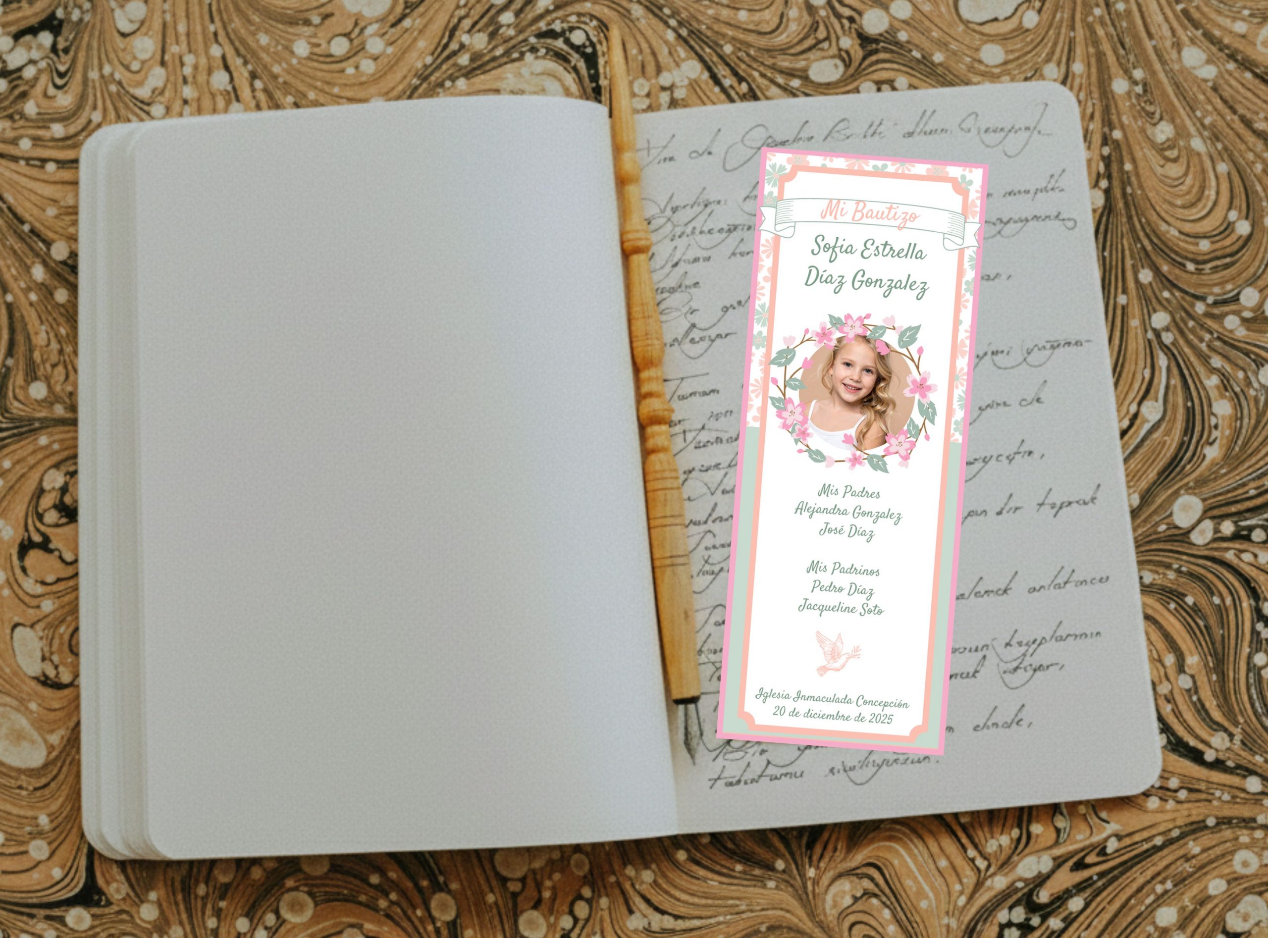 El marcador mide 14 × 5 cm aprox. Es impreso alta calidad en papel opalina extrablanco, ademas viene plastificado para una mayor durabilidad. El texto, color de borde e imagen pueden ser reemplazados por los que usted nos indique, también pueden incluir foto sin alterar su valor.