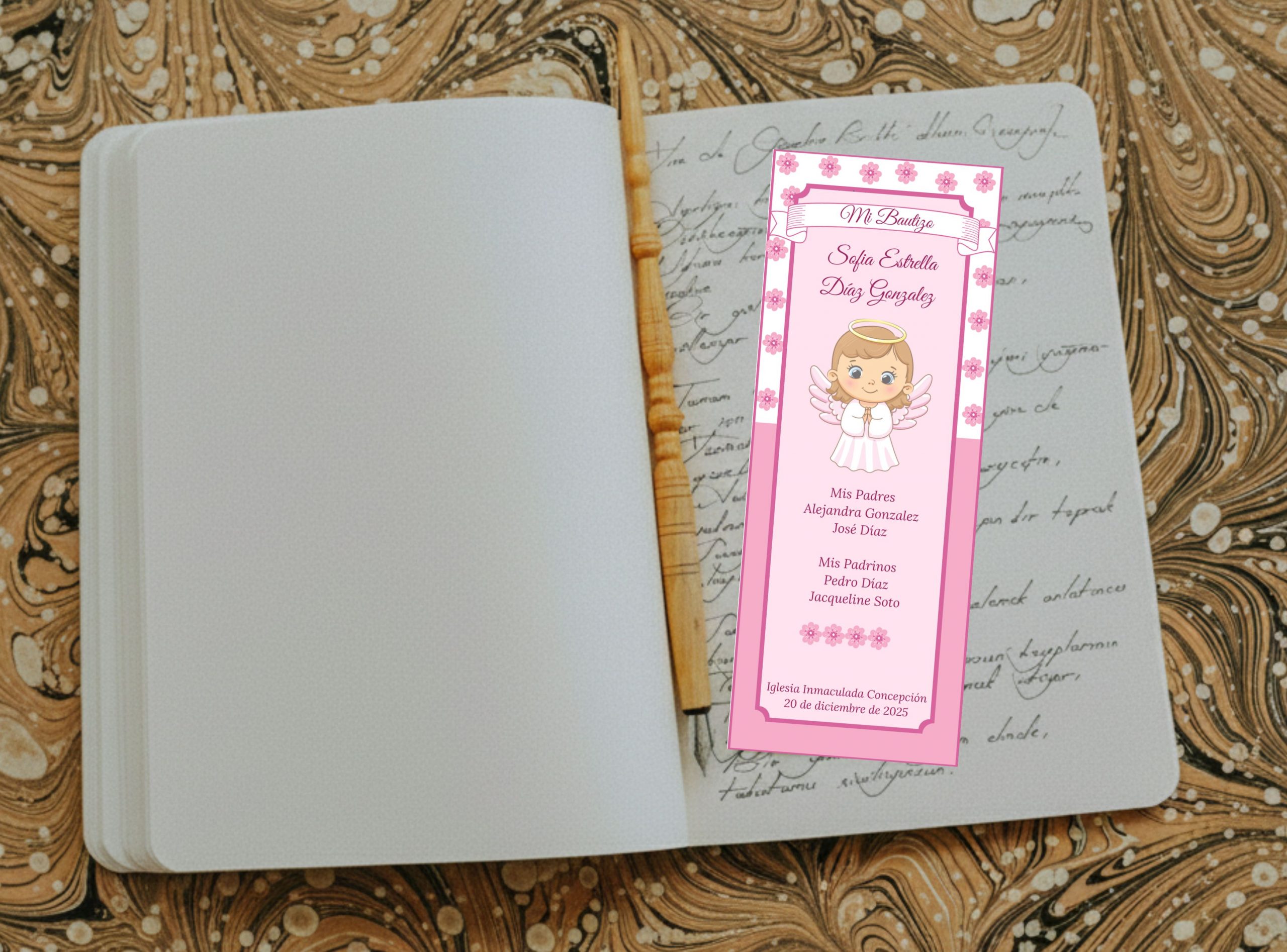 El marcador mide 14 × 5 cm aprox. Es impreso alta calidad en papel opalina extrablanco, ademas viene plastificado para una mayor durabilidad. El texto, color de borde e imagen pueden ser reemplazados por los que usted nos indique, también pueden incluir foto sin alterar su valor.