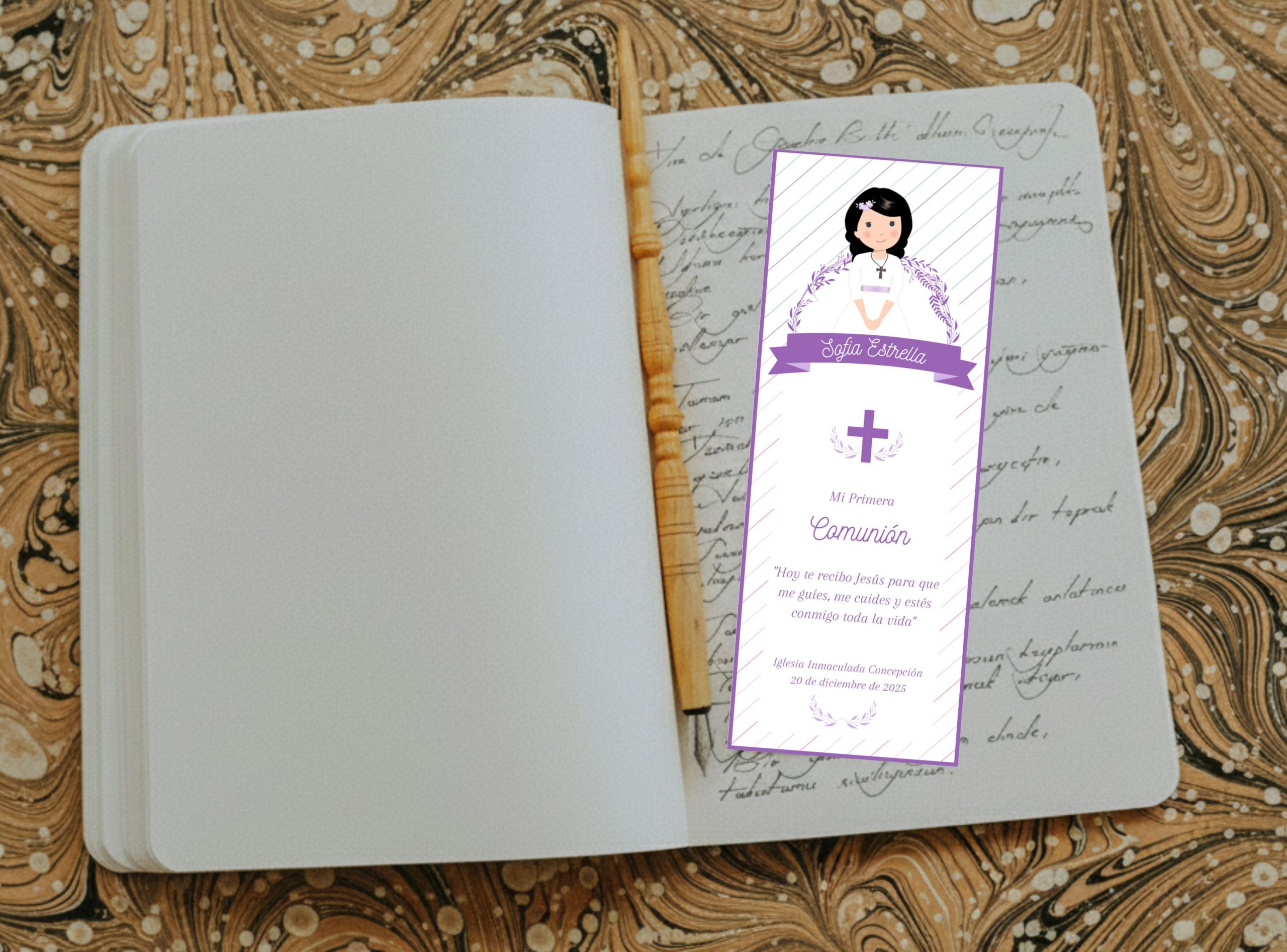 El marcador mide 14 × 5 cm aprox. Es impreso alta calidad en papel opalina extrablanco, ademas viene plastificado para una mayor durabilidad. El texto, color de borde e imagen pueden ser reemplazados por los que usted nos indique, también pueden incluir foto sin alterar su valor.