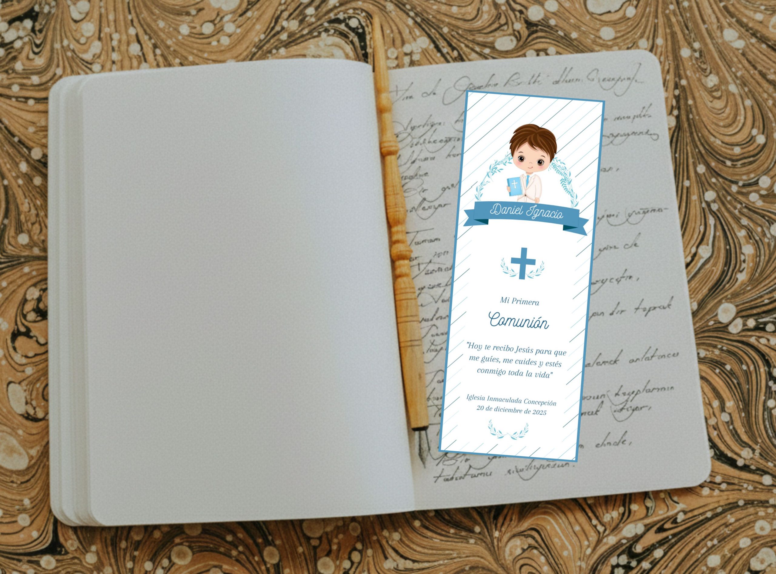 El marcador mide 14 × 5 cm aprox. Es impreso alta calidad en papel opalina extrablanco, ademas viene plastificado para una mayor durabilidad. El texto, color de borde e imagen pueden ser reemplazados por los que usted nos indique, también pueden incluir foto sin alterar su valor.