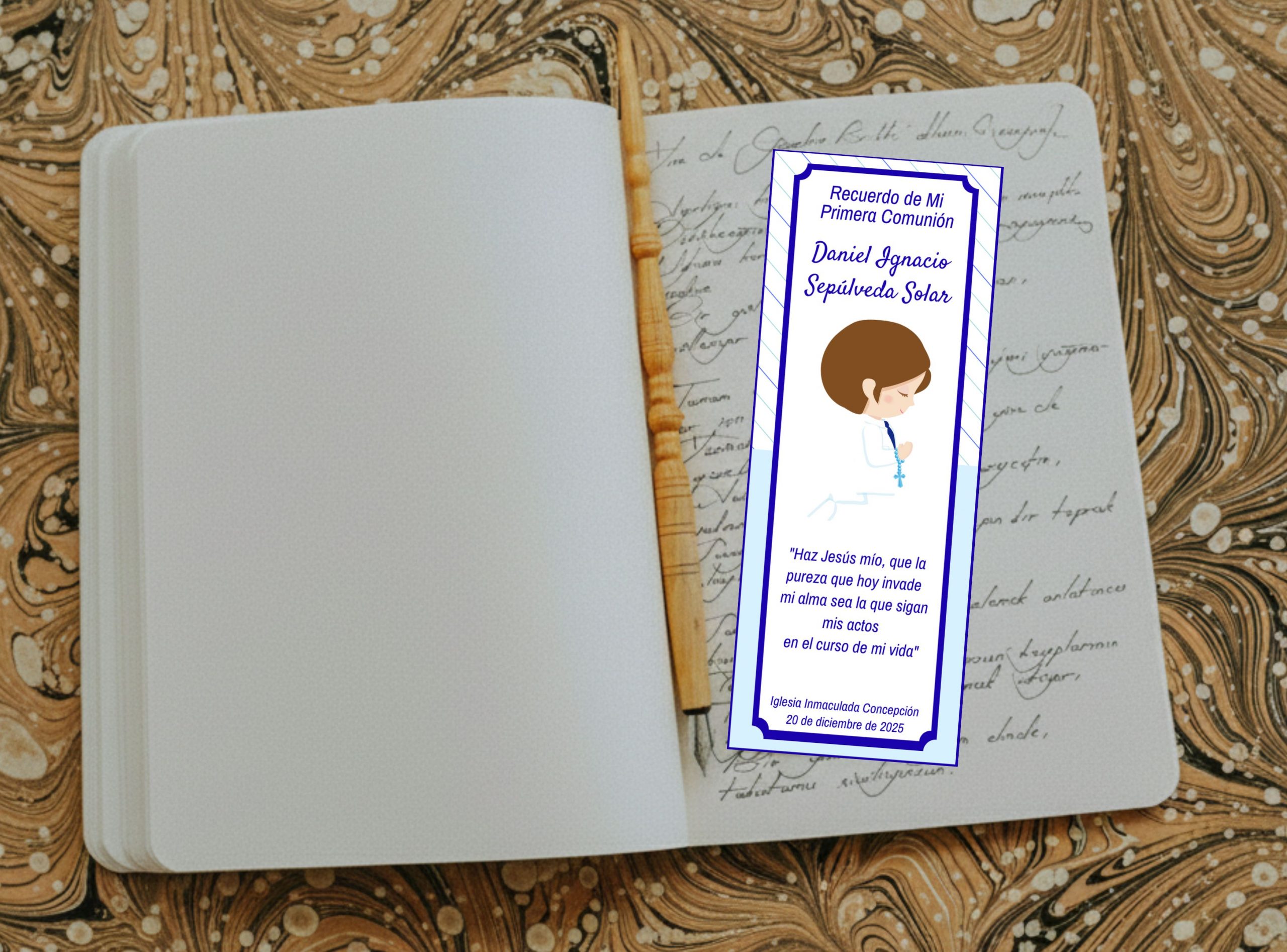 El marcador mide 14 × 5 cm aprox. Es impreso alta calidad en papel opalina extrablanco, ademas viene plastificado para una mayor durabilidad. El texto, color de borde e imagen pueden ser reemplazados por los que usted nos indique, también pueden incluir foto sin alterar su valor.