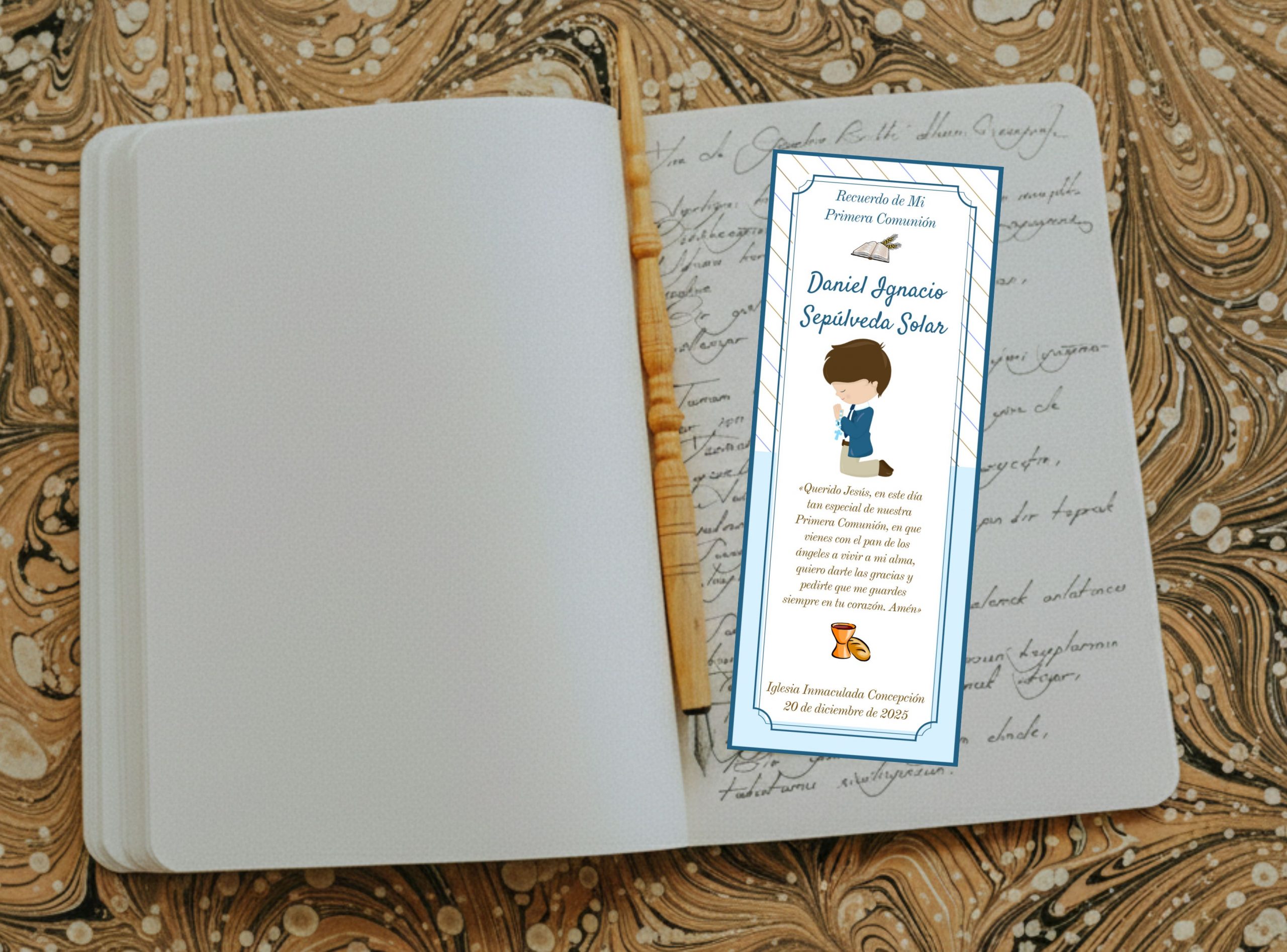 El marcador mide 14 × 5 cm aprox. Es impreso alta calidad en papel opalina extrablanco, ademas viene plastificado para una mayor durabilidad. El texto, color de borde e imagen pueden ser reemplazados por los que usted nos indique, también pueden incluir foto sin alterar su valor.