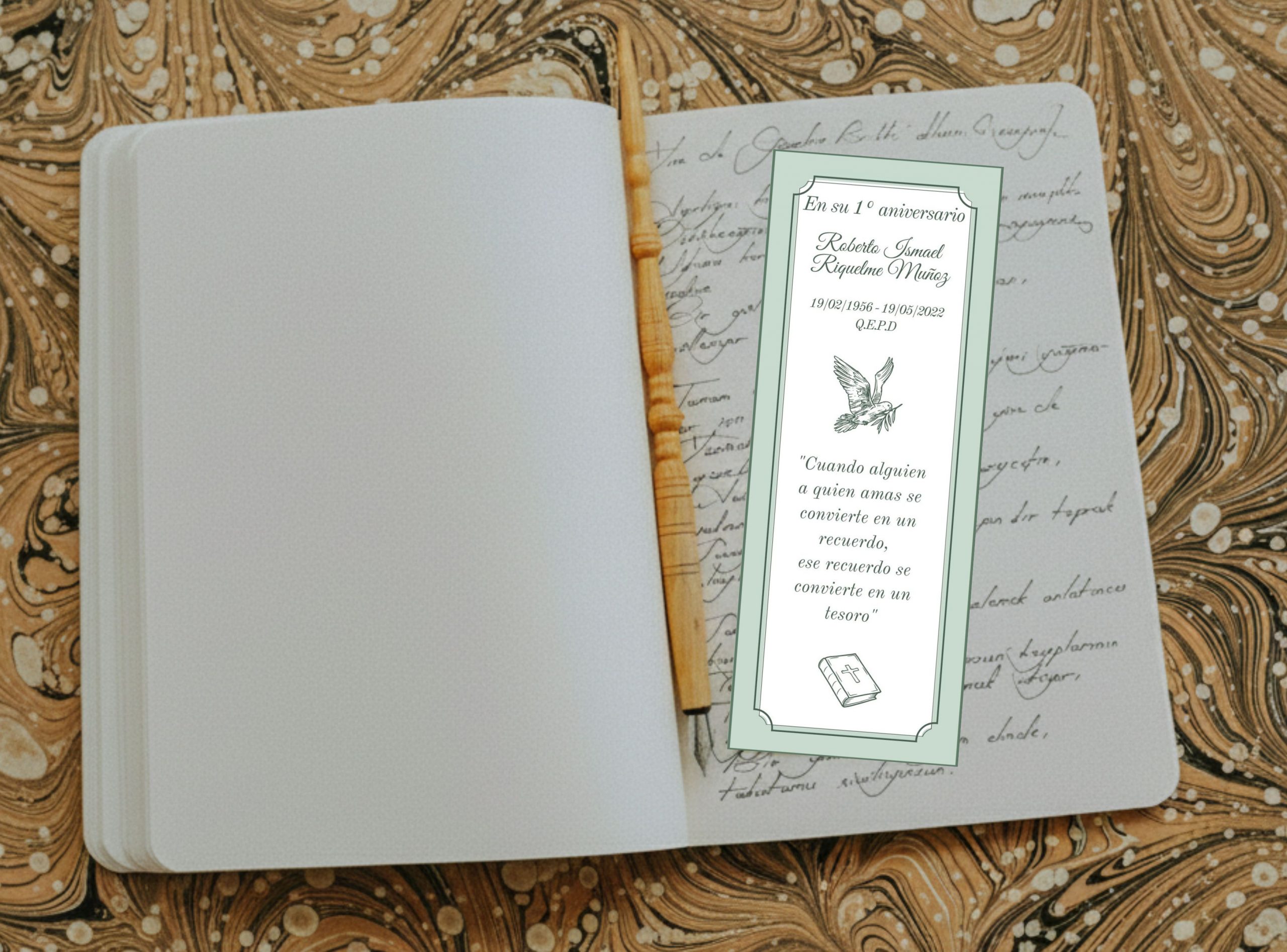 El marcador mide 14 × 5 cm aprox. Es impreso alta calidad en papel opalina extrablanco, ademas viene plastificado para una mayor durabilidad. El texto, color de borde e imagen pueden ser reemplazados por los que usted nos indique, también pueden incluir foto sin alterar su valor.