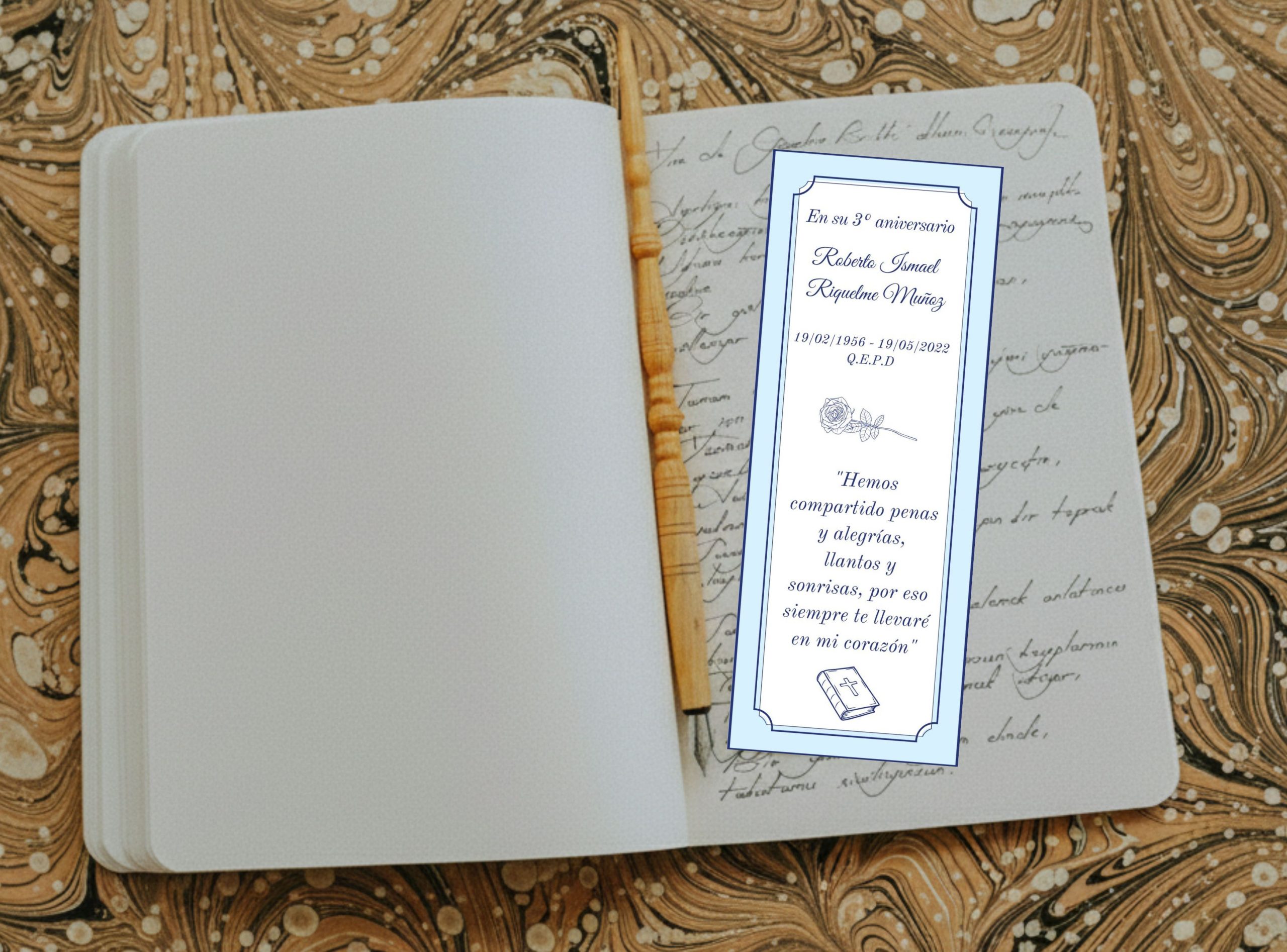 El marcador mide 14 × 5 cm aprox. Es impreso alta calidad en papel opalina extrablanco, ademas viene plastificado para una mayor durabilidad. El texto, color de borde e imagen pueden ser reemplazados por los que usted nos indique, también pueden incluir foto sin alterar su valor.