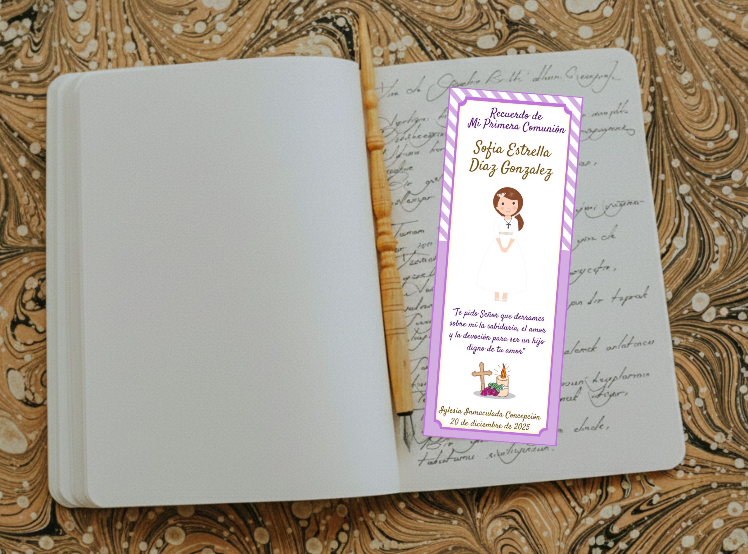 El marcador mide 14 × 5 cm aprox. Es impreso alta calidad en papel opalina extrablanco, ademas viene plastificado para una mayor durabilidad. El texto, color de borde e imagen pueden ser reemplazados por los que usted nos indique, también pueden incluir foto sin alterar su valor.