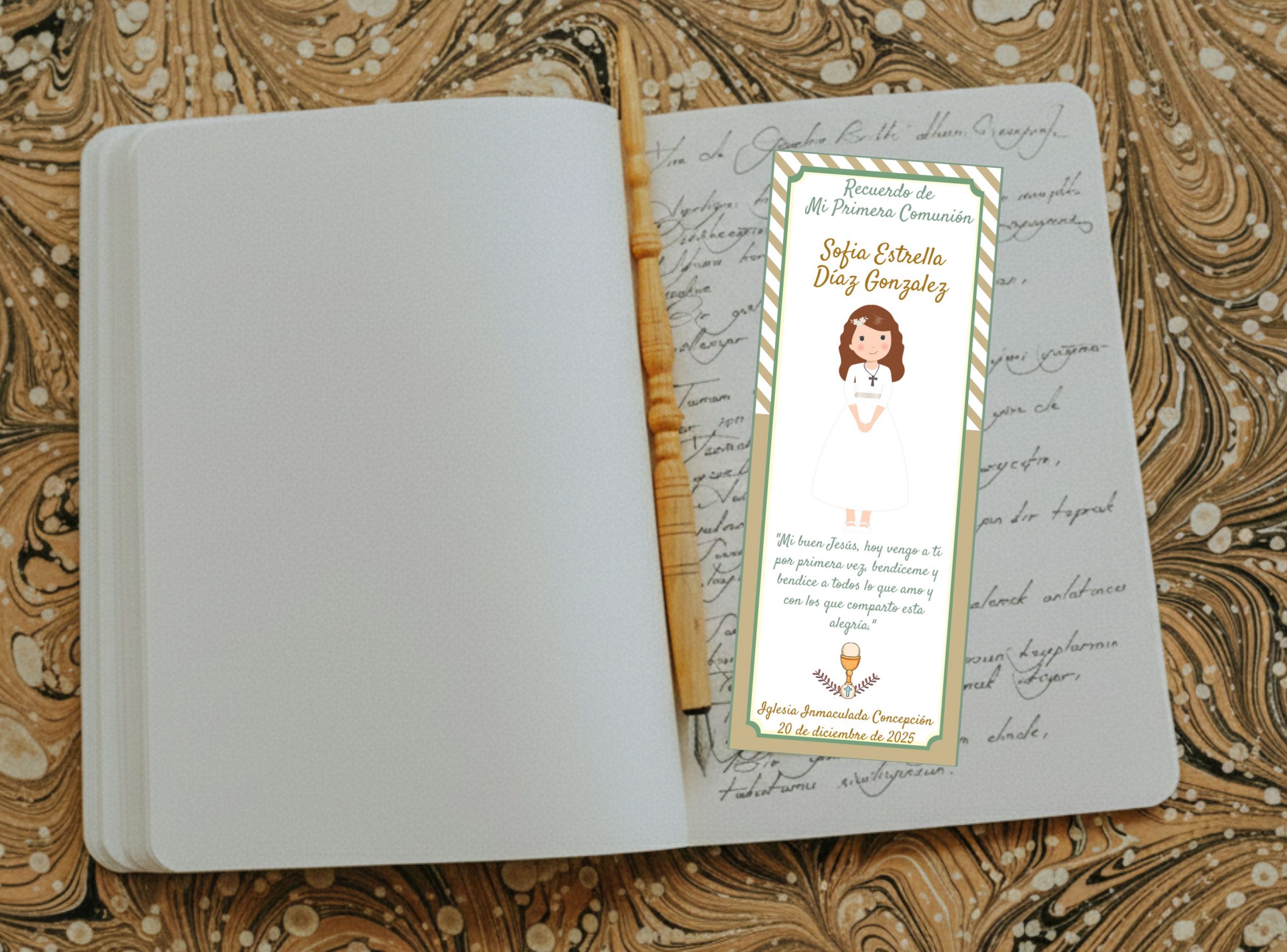 El marcador mide 14 × 5 cm aprox. Es impreso alta calidad en papel opalina extrablanco, ademas viene plastificado para una mayor durabilidad. El texto, color de borde e imagen pueden ser reemplazados por los que usted nos indique, también pueden incluir foto sin alterar su valor.